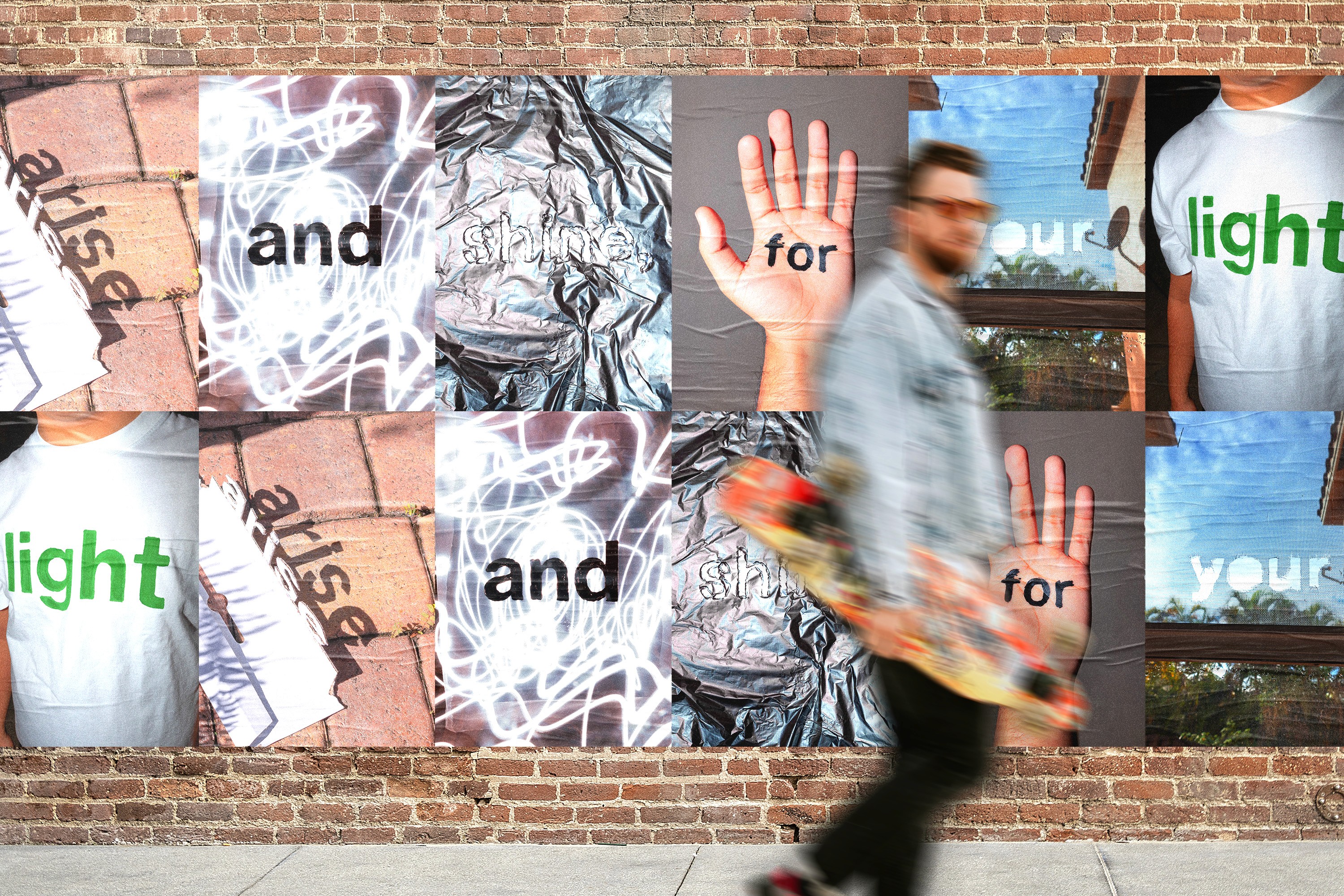 As a marketing campaign, Arise and Shine is designed to command attention at scale. The bold, physical presence of the words translates seamlessly into large-format advertisement, where the viewer is drawn in by it’s experimental qualities. The photographs can be broken up into 8 parts, displayed in sequence as typographic billboards.