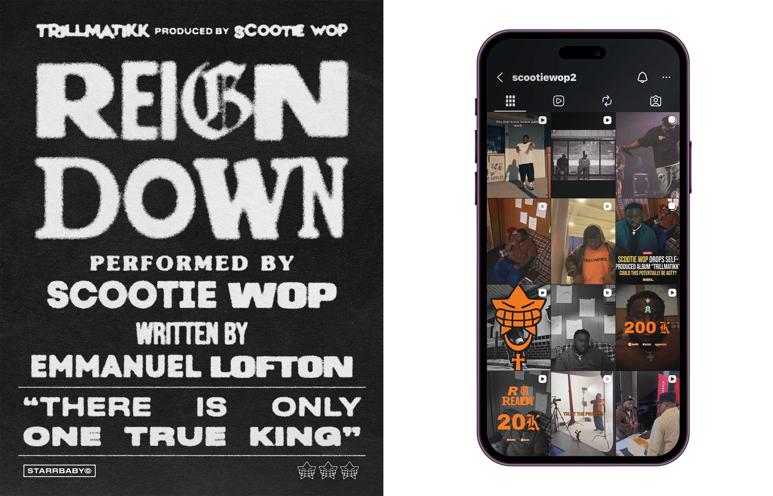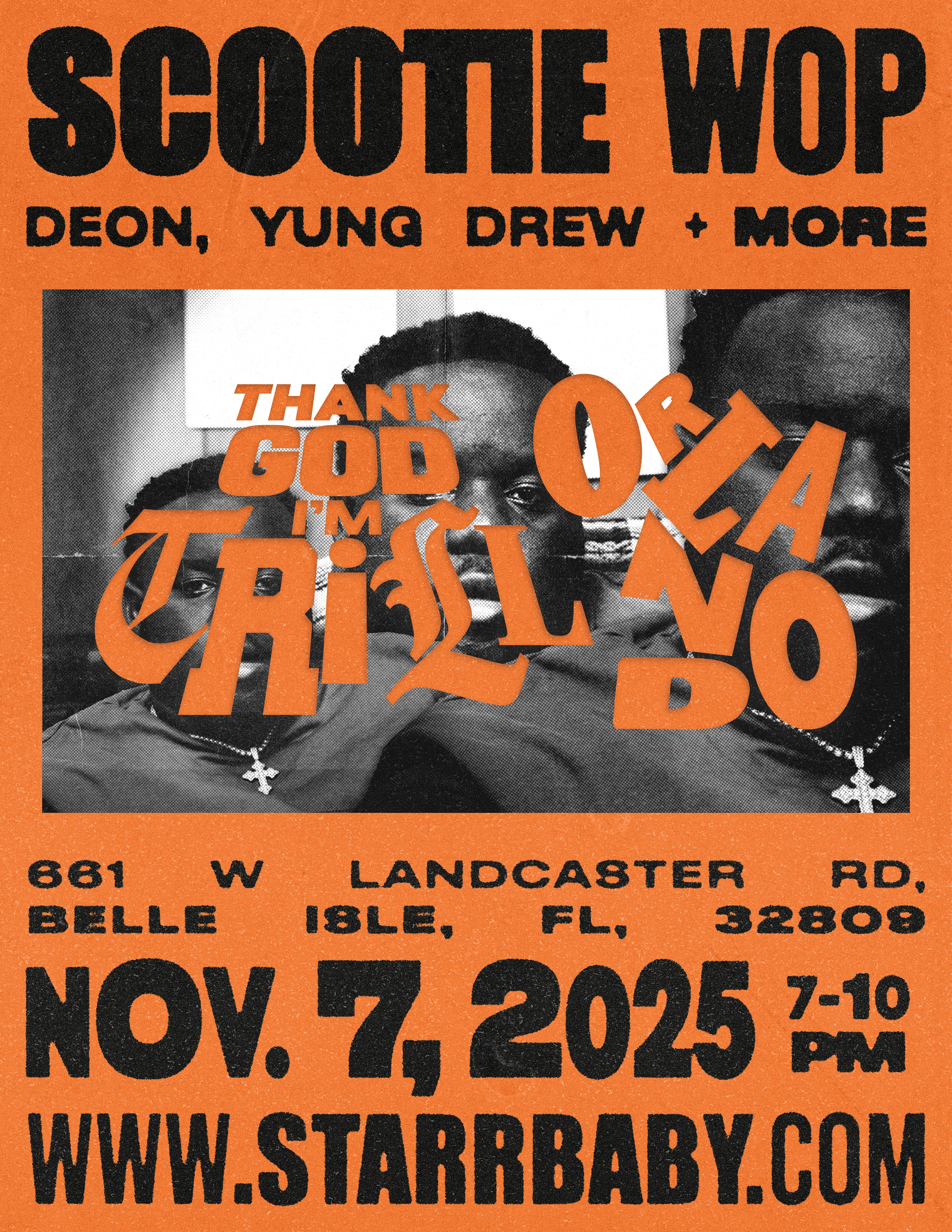 TRILLMATIKK, released in 2025, is a full-length project that brings together heavy, Texas-sample-driven beats, sharp lyricism, and unapologetic authenticity, standing as the centerpiece of ScootieWop’s journey. The art direction behind TRILLMATIKK is built around Scootie’s vision of the album representing warmth, resilience, and Southern pride: down-south tones, early-2000s style, gold grills, cookouts, and community at its core. Every element is designed to live within the Trillmatikk universe, blending analogue and digital tools to create logotypes, music videos, merchandise, concert flyers, visuals, and album artwork. TRILLMATIKK emerged as a statement, a movement, and a lived-in ecosystem, capturing ScootieWop’s unfiltered creative spirit, personal aesthetics, and a bold new chapter in his rapidly rising career.